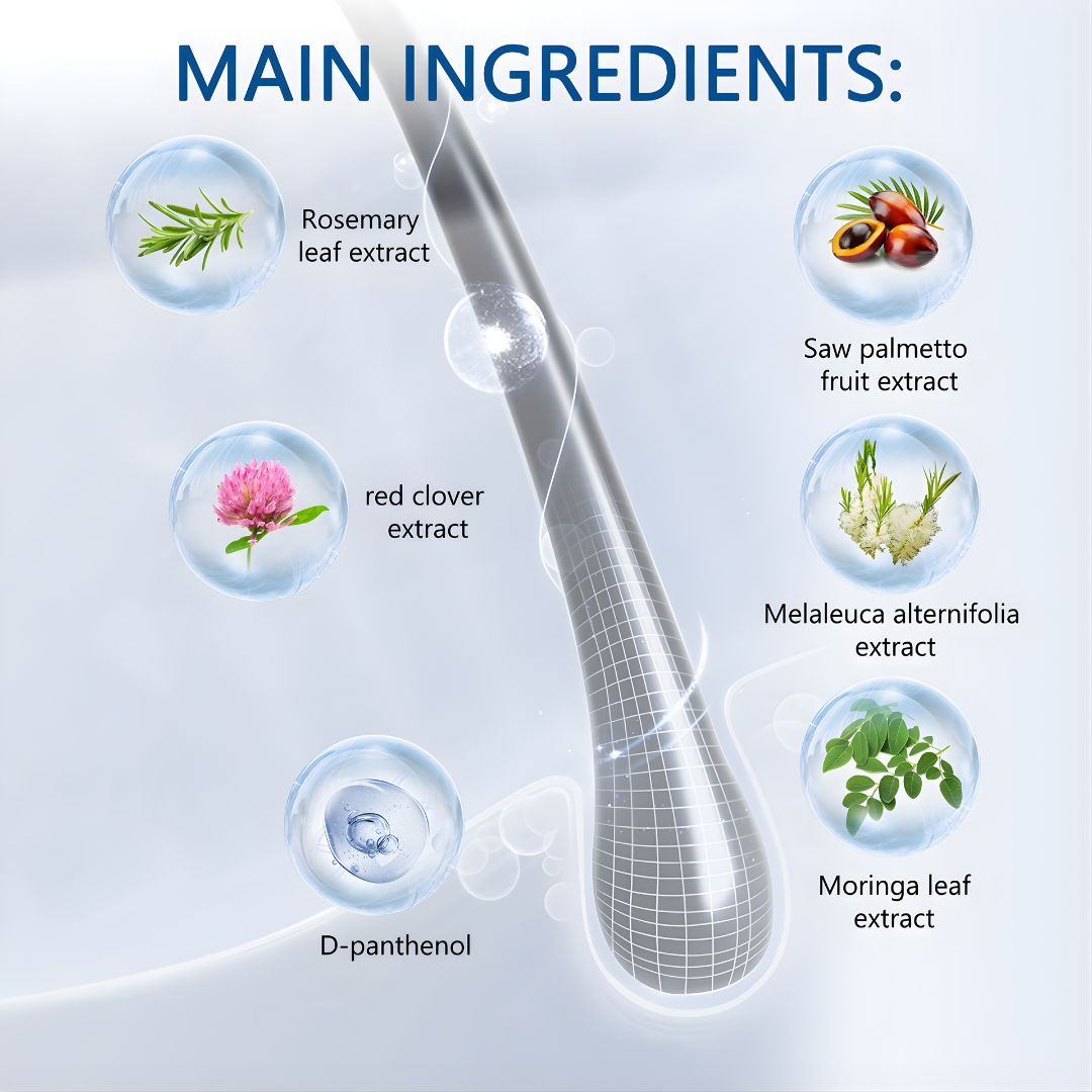 🌸 Red Clover Extract – Rich in biochanin A, it helps balance scalp hormones and reduce hair thinning over time.